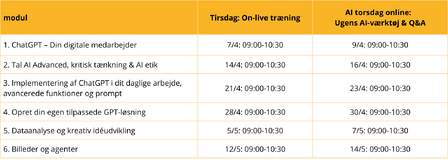 Kurset foregår onlive (online, men live), hvor du hver uge starter med 1,5 times interaktiv worksession (Tirsdag), hvor vi starter helt fra bunden, men i løbet af 6 uger får du en lang række værktøjer, som vil hjælpe dig med at blive mere effektiv i din hverdag. Du vil blandt andet lære at bruge ChatGPT til: